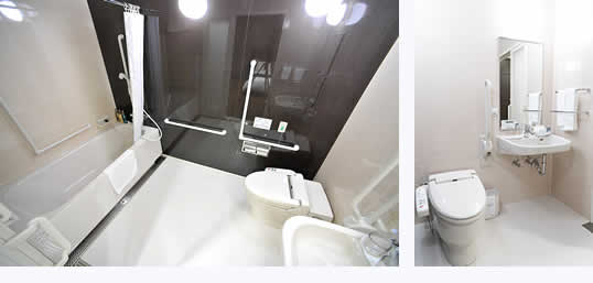 The steps inside the room and at the bathroom entrance have been eliminated. The room is also equipped with an accessible sink, a wheelchair-accessible toilet, and a bathtub designed for ease of use.